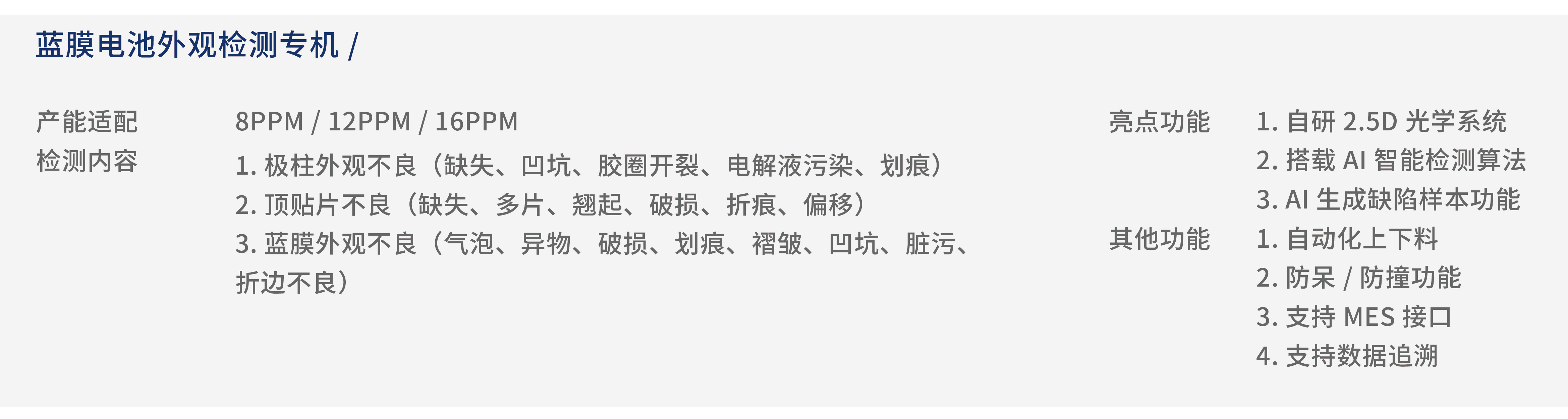 設(shè)備用于藍(lán)膜電池外觀檢測(cè),采用自動(dòng)上下料和特制輸送機(jī)構(gòu),搭載智能AI算法的自主研發(fā)檢測(cè)軟件,實(shí)現(xiàn)電池質(zhì)量的精準(zhǔn)品質(zhì)把控。